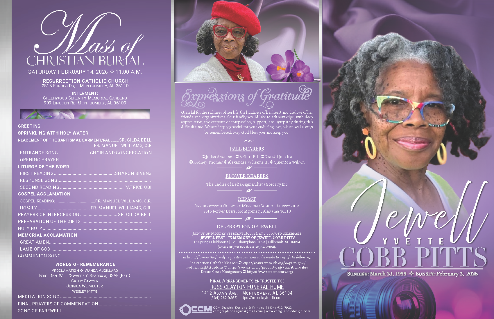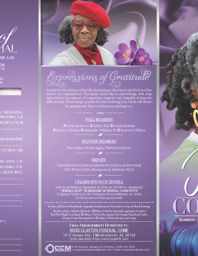 - Project Title: Obituary Trifold Design: Jewell Yvette Cobb Pitts